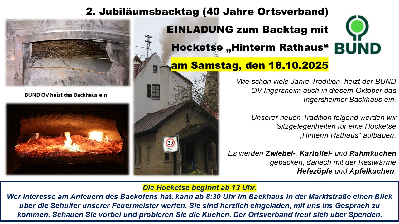 Wie schon viele Jahre Tradition, heizt der BUND OV Ingersheim auch am Kirbesamstag das Ingersheimer Backhaus an. Unserer neuen Tradition folgend werden wir Sitzgelegenheiten für eine Hocketse „Hinterm Rathaus“ aufbauen.
