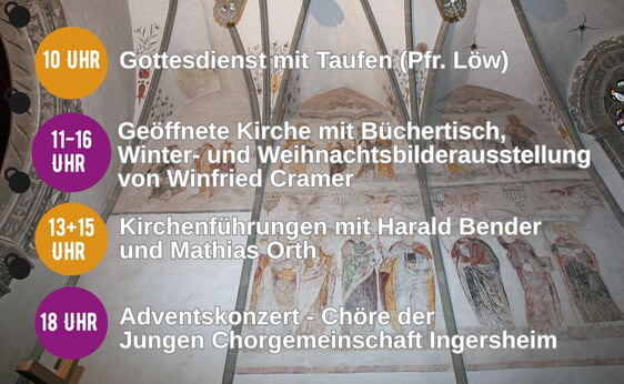 Ein Büchertisch lädt zum Geschenkeeinkauf ein und zwei Kirchenführungen um 13 und 15 Uhr mit Harald Bender und Mathias Orth werden angeboten. Um 18 Uhr laden Chöre der Jungen Chorgemeinschaft e.V. mit "Musik im Advent" zum Mitsingen, Zuhören und Genießen ein.