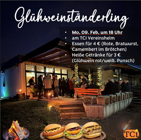 Das Event aus der 50-Jahre-Jubiläumsreihe kam bei euch, TCI'lern, besonders gut an. Daher war die Entscheidung relativ schnell getroffen, dass das Event auch in 2026 stattfinden soll. Wir freuen uns, euch am Montag, den 09.02.26, um 18 Uhr auf die Vereinsterasse zu einem weiteren Glühweinständerling einladen zu dürfen. Neben Heißgetränken (roter/ weißer Glühwein und Saftpunsch) und Kaltgetränken wird es auch leckere Brötchen (Rote Wurst, Bratwurst, und gebackenen Camembert) geben. Im Tennisraum kann man sich zwischendurch aufwärmen. Bei Fragen dürft ihr euch gerne an den Festauschuss wenden.
