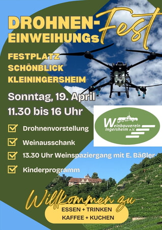 Ab dem Jahr 2026 wird kein Spritz-Hubschrauber die Ingersheimer Weinberge überfliegen. Stattdessen soll der Pflanzenschutz in den Steillagen künftig mit moderner Drohnentechnik erfolgen. Für die Anschaffung einer Agrardrohne wurde 2025 der Weinbauverein gegründet und Spenden gesammelt. Um unseren UnterstüterInnen und interessierten BürgerInnen die neue Technik sowie die geplanten Veränderungen vorzustellen, lädt der Weinbauverein Ingersheim herzlich am 19. April ein. Die neue Agrardrohne wird und um 12 Uhr vorgestellt und mit einer GRATIS – Seccorunde offiziell eingeweiht.