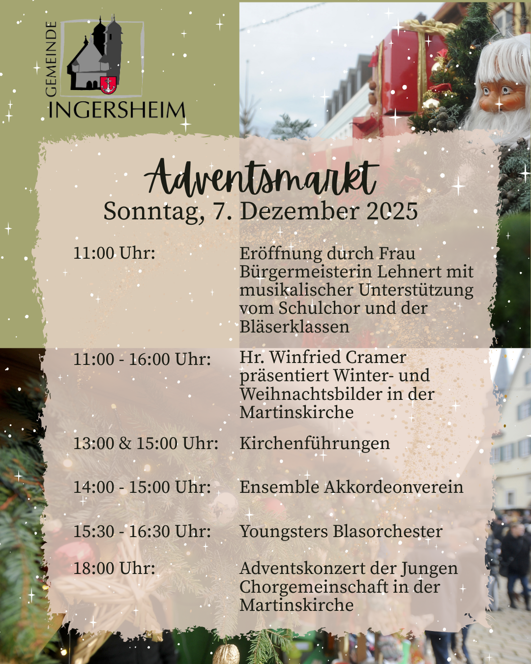 Die Gemeinde Ingersheim freut sich, Sie auf dem 25. Ingersheimer Adventsmarkt begrüßen zu dürfen, und wünscht Ihnen eine besinnliche, angenehme und vorweihnachtliche Zeit mit vielen schönen Begegnungen.
